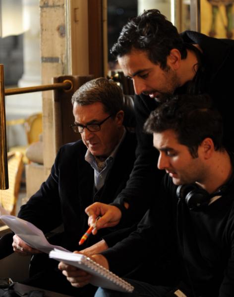 François Cluzet et les deux réalisateurs du film INTOUCHABLES (2011), Eric Toledano et Olivier Nakache relisent le script du film.